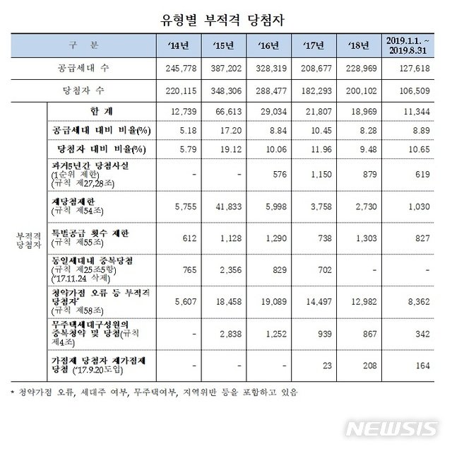 2일 국회 국토교통위원회 소속 더불어민주당 강훈식 의원(충남 아산을)이 국토교통부에서 받은 ‘주택 청약 부적격 당첨자 통계’에 따르면, 최근 5년간(2014년~2019년 8월 말) 전국에 분양된 152만6563세대 중 10.5%(16만506세대)는 청약자가 자격 미달인 것으로 판명 나 당첨이 취소됐다.