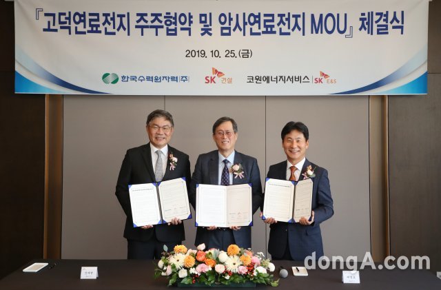 한국수력원자력이 25일 서울 중구 더플라자호텔에서 SK건설, 코원에너지서비스와 ‘고덕연료전지 주주협약 및 암사연료전지 공동개발 양해각서(MOU)’를 체결했다.