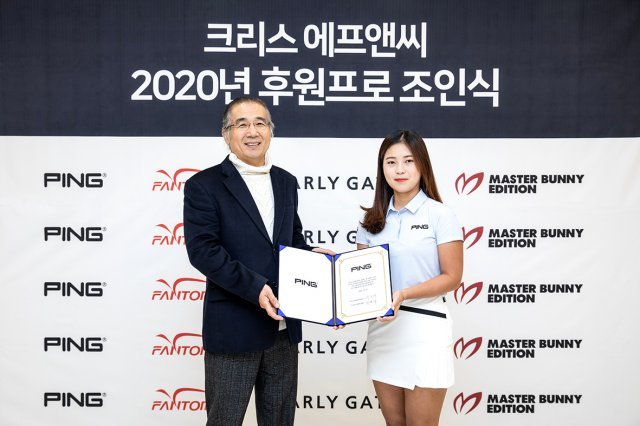크리스에프앤씨(대표 우진석)가 14일 프로골퍼 전예성 선수와 의류 후원계약을 체결했다. 김한흠 사장(왼쪽)과 프로 골퍼 전예성 선수가 기념 촬영하고 있다.