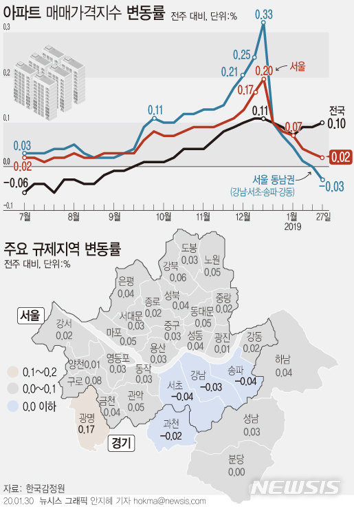 30일 한국감정원의 ‘2020년 1월4주 주간아파트 가격동향’에 따르면, 지난 27일 기준 서울 아파트값은 한 주간 0.02% 올라, 지난 주(0.03%)보다 오름폭이 축소됐다.