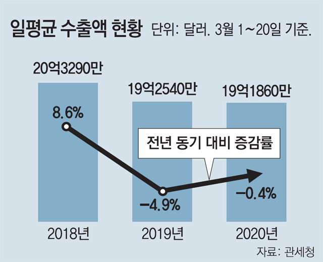 23일 관세청에 따르면 이달 1∼20일 기준 일평균 수출액은 19억1860만 달러로 전년 같은 기간 대비 0.4% 줄었다. 작년 3월 1∼20일 일평균 수출액은 2018년 대비 4.9% 줄었는데 올 들어 그보다도 더 쪼그라든 것이다. 정부는 작년 수출 지표가 워낙 좋지 않았기 때문에 올해는 기저효과로 수출액이 반등할 것으로 기대했다. 하지만 예기치 못한 코로나19 사태의 영향으로 작년보다 수출 규모가 계속 줄어드는 양상이다.