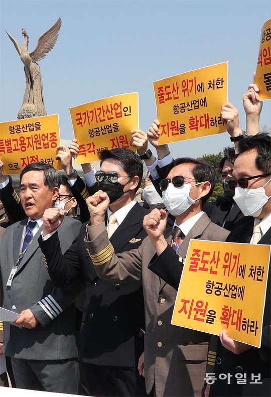 대한민국 조종사 노동조합 연맹과 항공 지상조업사로 구성된 전국연합 노동조합연맹이 14일 오전 청와대 앞 분수대 광장에서 기자회견을 열고 위기의 항공산업에 대한 신속한 정부 지원을 촉구하고 있다. 이들은 “항공사와 지상 조업사까지 정부 지원을 확대해 붕괴 직전의 항공산업을 지켜내야 한다”고 호소했다.