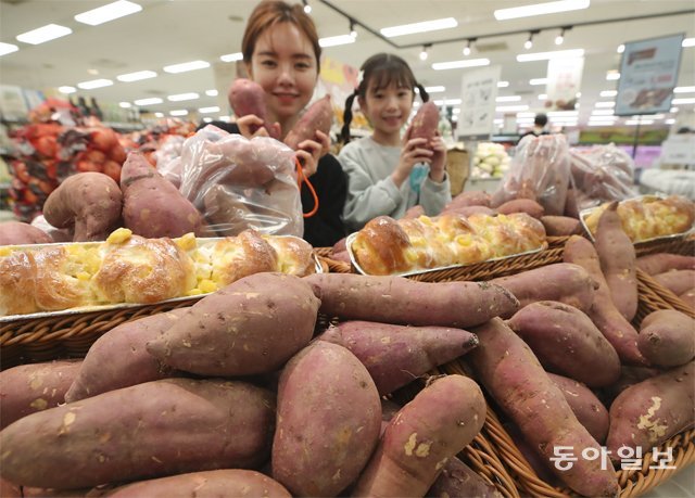 23일 서울 이마트 용산점에서 모델들이 ‘해남 못난이 왕고구마’를 소개하고 있다. 이마트는 28일까지 해남 못난이 왕고구마(1봉지 3kg)를 9980원에 판매한다. 이번 농가 상생 프로젝트는 정용진 신세계그룹 부회장이 ‘상품성이 떨어지는 고구마를 구매해 달라’는 백종원 더본코리아 대표의 부탁을 받아들여 성사됐다.