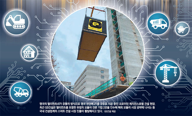 모듈러 공법은 코로나19 이후 각광받는 대표적인 스마트 건설 기술이다. 모듈러 공법은 주요 구조물을 공장에서 사전 제작한 후 공사 현장에서는 설치와 내외장 마감 등만 진행하는 방식이다. 최근 건설업계에서는 모듈러 시장 진출에 적극적이다. GS건설은 올해 초 폴란드의 목조 전문 모듈러 기업 단우드와 영국의 철골 전문 모듈러 기업 엘리먼츠를 동시에 인수했다. GS건설 관계자는 “유럽과 미국 등지에서는 모듈러 시장 규모가 커 현지 기업을 인수했다”며 “모듈러 공법 기술을 해외 진출의 신성장 동력으로 삼을 것”이라고 말했다.