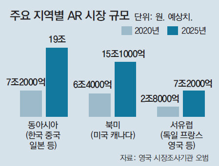 특히 AR 시장을 북미, 유럽이 아닌 한국 중국 일본 등 동아시아 3국이 주도할 것이란 전망도 나온다. 오범에 따르면 동아시아 AR 시장(약 7조 원)은 올해 북미(약 6조4000억 원) 보다 크고 2025년에는 그 격차가 더 벌어질 것으로 예상된다.