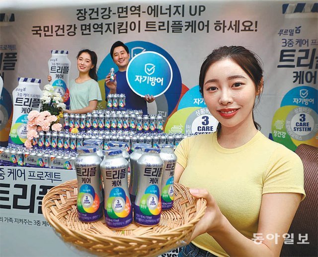 유제품 전문기업 ‘푸르밀’이 26일 서울 중구 한국의 집에서 새로 출시한 기능성 발효유 ‘트리플케어’(130mL 4개 기준 3980원)를 소개하고 있다. 트리플케어는 프로바이오틱스와 프리바이오틱스, 자기방어 성분을 포함한 ‘3중 케어 시스템’을 내세운 제품이다.
