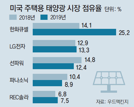 26일 글로벌 에너지 컨설팅 업체 우드맥킨지에 따르면 한화큐셀은 지난해 미국 주택용 태양광 시장에서 점유율 25.2%로 미국의 선파워 등을 제치고 1위에 올랐다. 점유율은 2018년 대비 11.1%포인트 늘어난 것이다. 또 상업용 태양광 시장에서도 점유율 13.3%로 1위를 차지했다. 특정 태양광 모듈 기업이 미국 주택 및 상업용 시장에서 동시에 1위에 오른 것은 2013년 이후 한화큐셀이 처음이다.