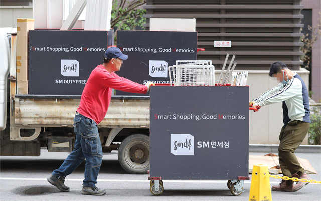30일 오후 서울 종로구 SM면세점 앞에서 관계자들이 짐을 옮기고 있다. 하나투어가 운영하는 SM면세점 서울점은 코로나19 여파로 인한 매출 급감으로 이날까지만 영업하고 철수한다.