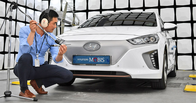 현대모비스가 외부의 전파와 음향이 차단된 전파무향실에서 그릴 커버를 활용한 가상 엔진 사운드시스템(AVAS)의 성능 시험을 하고 있다. 현대모비스가 개발한 AVAS는 기존 제품 대비 무게가 3분의 1 정도로 가볍고 크기도 절반으로 줄였다. 현대모비스 제공
