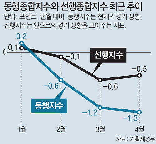 현재 경기를 보여주는 동행지수 순환변동치는 97.3으로 전월보다 1.3포인트 떨어져 외환위기 때인 1998년 3월(―2.0포인트) 이후 22년 1개월 만에 최대 하락폭을 나타냈다. 앞으로의 경기를 보여주는 순환변동치도 전월보다 0.5포인트 하락하며 3개월 연속 하락세를 이어갔다. 설비투자는 전월 대비 5.0%, 전년 대비 1.4% 늘며 선방했다.