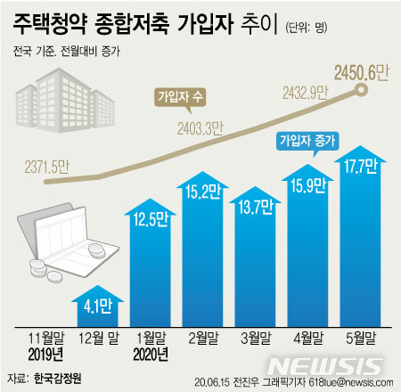 16일 한국감정원의 청약홈 시스템에 따르면 지난 5월 말 기준 전국 주택청약종합저축 가입자 수는 2450만5569명으로 4월 말(2432만8888명) 대비 17만6681명 늘었다.