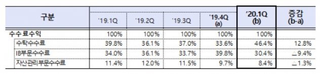 전체 수수료수익 중 수탁수수료 비중은 46.4%로 전 분기 대비 12.8%포인트 증가했지만, 같은 기간 IB부문 수수료 비중은 9.4%포인트 감소한 30.4%로 나타났다. 전 분기에는 IB부문 수수료(39.8%)가 수탁수수료(33.6%)보다 비중이 컸지만, 코로나19의 영향으로 상황이 역전된 것이다. 앞서 IB부문의 성장세에 힘입어 IB부문 수수료 비중이 점차 높아져 지난해에는 수탁수수료 비중과 엇비슷한 수준을 보인 바 있다.