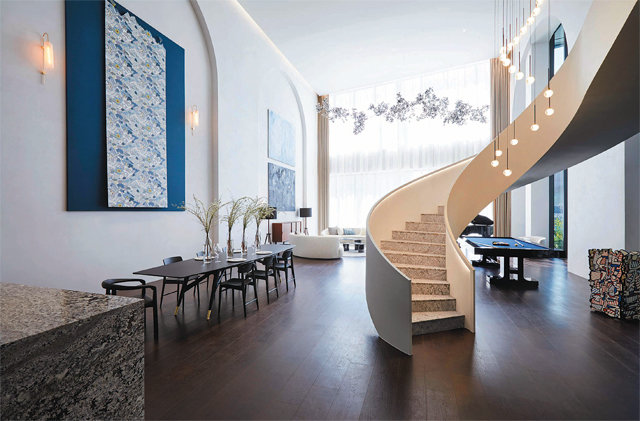첫 번째 집은 웰니스(wellness)를 추구하고 예술적 취향을 지닌 부부의 라이프스타일을 담은 313m²의 펜트하우스다. 통창으로 들어오는 채광이 가득 찬 거실, 테라스와 외부 조경을 연계해 개방감을 극대화한 다이닝룸이 눈에 띈다. 이 밖에 사우나, 필라테스 룸 등 건강을 생각한 공간도 마련했다. 특히 세계적 디자이너 디터 람스의 컬렉션을 만날 수 있는 컬렉터의 방도 구현했다. 직접 식물을 재배할 수 있는 스마트팜 기기가 갖춰진 주방, 집 안에서도 자연을 즐길 수 있는 중정 등 세계적인 주거 트렌드인 친환경 라이프스타일을 반영한 공간을 만날 수 있다.