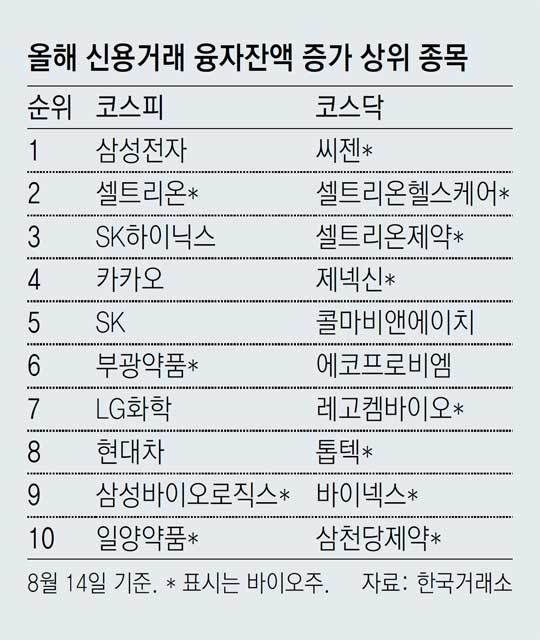 16일 한국거래소에 따르면 올해 들어 14일까지 투자위험종목 지정 건수 27건 중 의약품과 의료기기, 마스크 등 바이오 종목은 20건이었다. 증권사로부터 돈을 빌려 투자하는 신용융자 잔액이 많이 증가한 상위 10개 종목 중에서도 코스피 4개, 코스닥 8개가 바이오 업체였다. 코로나19 확산 초기 마스크 업체에서 시작된 바이오 열풍은 진단키트, 치료제, 백신, 인공호흡기 업체로 확장되고 있다.