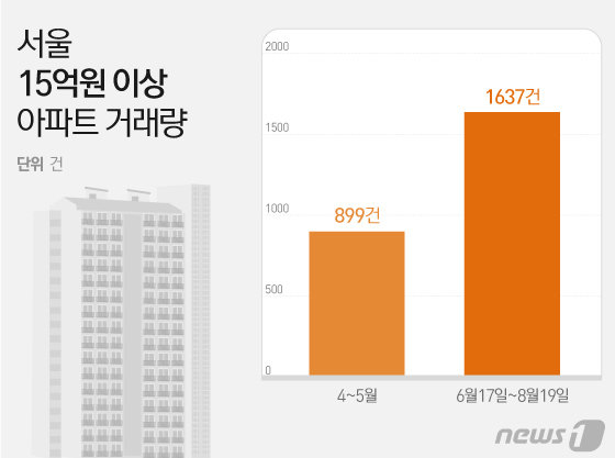 20일 국토교통부 실거래가 공개시스템을 분석한 결과에 따르면 지난 6월 17일부터 8월 19일까지 약 두 달간 서울의 15억원 이상 아파트 거래량은 1637건으로 집계됐다. 직전 4~5월 거래량(899건)보다 82.1% 증가했다.