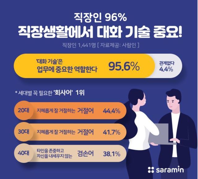 구인구직 매칭 플랫폼 사람인(대표 김용환)이 직장인 1,441명을 대상으로 ‘직장생활 말하기(회사어) 구사능력’에 관한 설문조사를 한 결과 응답자의 95.6%가 ‘대화 기술은 업무에 중요한 역할을 한다’고 답했다. 직장안에서 활용하는 일명 ‘회사어’ 말하기 능력으로 필요한 도움을 얻을 수도 있고, 업무 성과를 창출 할 수 있다고 보는 것이다.