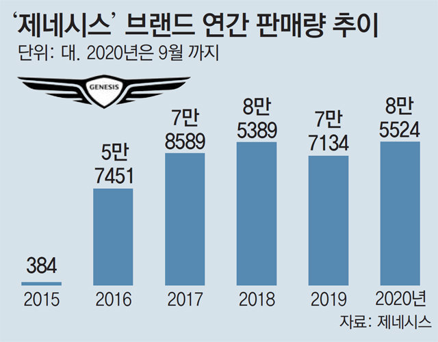 1일 자동차 업계에 따르면 2015년 11월 4일 공식 출범한 제네시스 브랜드는 올 9월까지 글로벌 시장에서 38만4471대를 판매했다. 출범 첫해 384대를 판매한 것을 시작으로 2016년 5만7451대, 2017년 7만8589대, 2018년 8만5389대, 2019년 7만7134대를 팔았다.