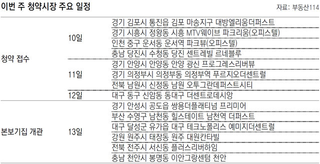 지난주 경기 과천과 하남에서의 아파트 분양에 수십만 명이 몰리는 등 수도권 청약 열기가 뜨거웠던 가운데 11월 둘째 주에는 경기 김포와 의정부 등에서 공급이 이어진다. 9일 부동산정보업체인 부동산114에 따르면 11월 둘째 주에 전국 9개 단지에서 총 5485채(일반분양 4338채)가 분양을 시작한다. 경기 김포시 통진읍 ‘김포 마송지구 대방엘리움더퍼스트’, 경기 의정부시 의정부동 ‘의정부역 푸르지오더센트럴’ 등이 수요자의 눈길을 끌고 있다.