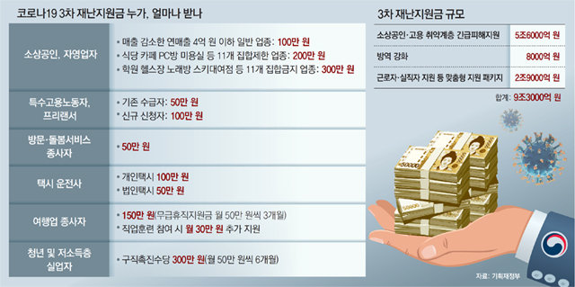 내년 1월 11일부터 신종 코로나바이러스 감염증(코로나19) 재확산으로 피해를 본 소상공인과 고용 취약계층 580만 명에게 9조3000억 원 규모의 3차 재난지원금이 긴급 수혈된다. 연말연시 방역 강화로 문 닫은 스키장 내 식당과 근처 스키용품 대여점도 300만 원을 받고 법인택시 기사들은 50만 원을 지원받는다.