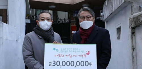 한국토지주택공사(LH)가 지난해 12월 31일 LH 임대주택 현장에서 매입·전세임대 거주 가구를 지원하기 위한 ‘따뜻한 겨울나기 지원금’ 전달식(사진)을 가졌다. 지원금은 총 3000만 원으로 LH 매입임대주택 입주자들이 마련한 1500만 원에 LH가 낸 기부금 1500만 원을 더해 조성됐다. 지원금은 주거복지연대가 매입·전세임대주택 취약계층 30가구에 각 100만 원씩 지원할 예정이다.