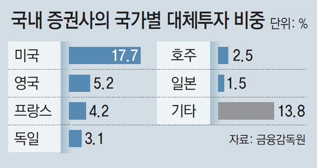 4일 금융감독원에 따르면 지난해 4월 말 현재 국내 22개 증권사의 해외 대체투자 규모는 48조 원으로 집계됐다. 오피스빌딩 호텔 콘도 등 해외 부동산 투자가 23조1000억 원(418건)이고, 발전소 항만 등 특별자산 투자(446건)가 24조9000억 원이다. 금융감독 당국이 증권사의 해외 대체투자 부실 여부를 점검해 결과를 공개한 건 이번이 처음이다.