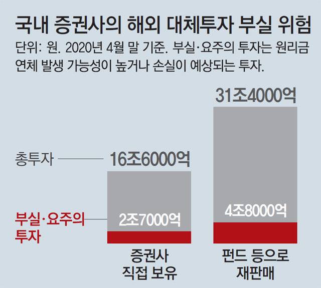 국내 증권사들이 해외 부동산 등에 투자한 대체투자 규모가 50조 원에 육박한 가운데 이 중 16% 정도는 부실 위험이 있는 것으로 분석됐다. 이 가운데 4조8000억 원이 펀드 등을 통해 개인 등에 재판매돼 증권사의 부실 위험이 투자자들에게 전이될 수 있다는 우려도 나온다.