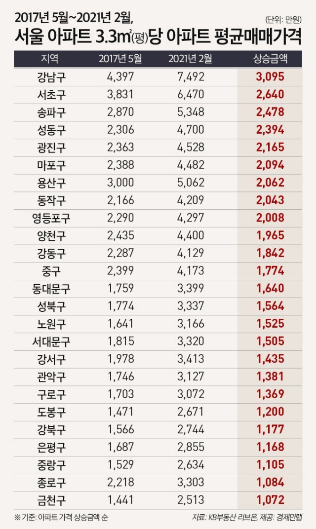 24일 부동산 정보제공 업체 경제만랩이 KB부동산 리브온의 주택가격동향을 살펴본 결과에 따르면, 지난 2017년 5월 서울 아파트 3.3㎡(평)당 평균 매매가격은 2326만원에서 올해 2월 4194만원으로 3.3㎡당 1868만원 상승했다.