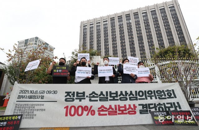 8일 전국자영업자협의회, 한국중소상인자영업자총연합회, 참여연대 민생희망본부 등 시민단체회원들이 서울 종로구 정부서울청사 앞에서 코로나19 자영업자 100% 손실보상 촉구 기자회견을 열었다. 김재명 기자 base@donga.com