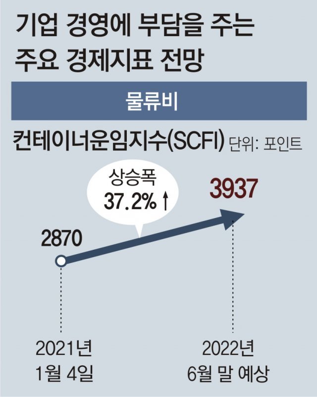 3일 전국경제인연합회가 국내 주요 증권사 리서치센터장을 대상으로 조사한 결과 물류비, 에너지, 원자재, 금리, 환경비용 등 기업에 부담으로 작용할 수 있는 지표들의 상승세가 내년 상반기(1∼6월) 말까지 이어진다고 나타났다고 밝혔다.