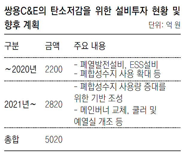 2018년 12월에 열린 이사회에서 쌍용C&E는 폐플라스틱 사용량을 확대하기 위한 제반 설비를 구축하는 내용의 대규모 투자를 결정했다. 그리고 2년 동안 1000억 원이 넘는 투자를 통해 폐플라스틱 사용량 확대를 위한 설비의 신·증설, 개조, 관련 인프라를 구축하는 것으로 지난해 11월 성공적인 투자공사를 통해 본격적으로 가동하기 시작했다. 2019년 150만 t 수준이었던 유연탄 사용량이 지난해 100만 t까지 줄었고, 폐합성수지는 70만 t 수준까지 확대 처리할 수 있는 설비를 갖췄다.