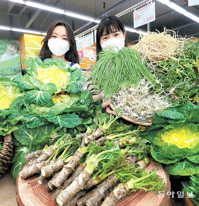 12일 서울 서초구의 농협 하나로마트 양재점에서 직원들이 봄나물 모음전을 선보이고 있다. 농협은 16일까지 열리는 봄나물 모음전에서 봄동, 달래, 냉이, 돌나물 등을 최대 51%까지 할인하는 행사를 진행한다.