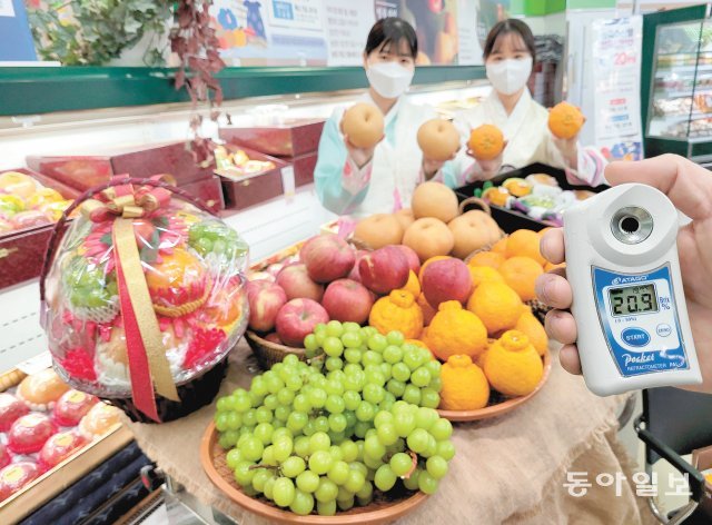 25일 서울 서초구 농협유통 하나로마트 양재점에서 모델들이 설을 맞아 고당도 프리미엄 과일 선물세트를 선보이고 있다. 농수산물 선물가액이 20만 원으로 한시 상향되며 10만 원대 고급 선물세트가 인기를 끌고 있다.