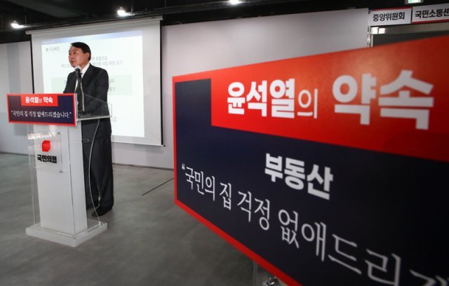 국민의힘 대권주자인 윤석열 전 검찰총장이 지난해 8월 29일 서울 여의도 중앙당사에서 ‘국민께 드리는 윤석열의 약속’ 부동산편 공약발표를 하고 있다. 사진공동취재단