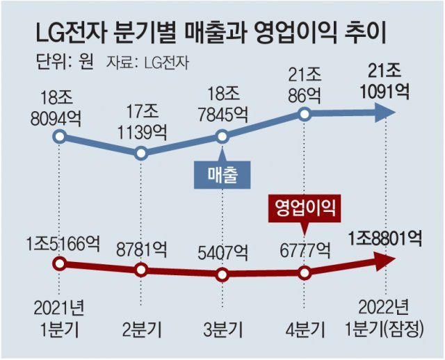 유가 상승, 글로벌 물류비용 증가, 원자재 가격 상승 등 대외적 불확실성이 커진 상황이었지만 오브제컬렉션과 유기발광다이오드(OLED) TV 등 프리미엄 제품 판매가 늘며 깜짝 실적을 거뒀다. 증권가에서는 생활가전(H&A사업본부)과 TV(HE사업본부) 매출이 전년 동기 대비 10% 이상 늘었을 것으로 보고 있다. 특히 생활가전 매출은 7조7000억 원 규모로 사상 최대 분기 매출을 달성한 것으로 보인다. 모니터 등을 생산하는 BS사업본부도 비대면 트렌드가 계속되는 상황에서 개학, 개강 등과 맞물려 처음으로 분기 매출 2조 원을 넘겼을 것으로 예상된다. 반면 자동차부품(VS사업본부)은 완성차 업체들의 생산 지연이 이어지며 매출이 지난해보다 감소한 것으로 추정된다.