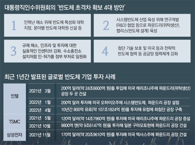 대통령직인수위원회가 반도체 사업 초격차 확보를 위한 지원 방안을 검토하고 있다고 밝혔다. 각국 정부가 반도체를 안보 이슈로 판단해 적극 육성하는 데 대응해 우리 정부도 인력난 해소, 산업 생태계 조성 등에 적극 나서겠다는 것이다.
