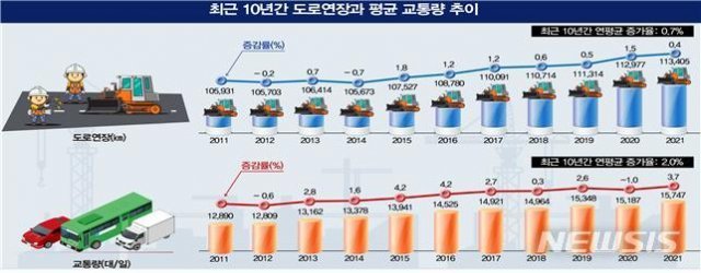 국토교통부는 이런 내용을 담은 ‘2021년 전국 도로현황 통계 및 도로교통량 통계연보’를 11일(오늘) 발표했다. 이 자료는 도로, 교통, 국토, 도시 등 다양한 분야에서 정책 수립이나 연구 등에 기초자료로 사용된다.