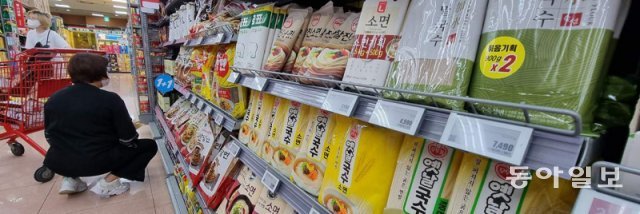 6일 서울 중구 롯데마트 서울역점을 찾은 고객이 국수 매대를 둘러보고 있다. 최근 국제 원자재 가격이