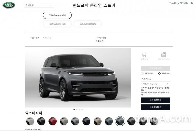 재규어랜드로버코리아는 7일 ‘신형 레인지로버 스포츠’ 사전계약 접수를 진행한다고 밝혔다. 사전계약은 랜드로버 온라인스토어에서 독점으로 이뤄진다. 심플한 페이지 구성으로 '클릭' 몇 번과 계약금 결제만 하면 간편하게 접수가 가능하다. 트림과 외장 및 내장 컬러를 선택하고 계약금 500만 원을 결제하면 사전계약 접수가 완료된다.