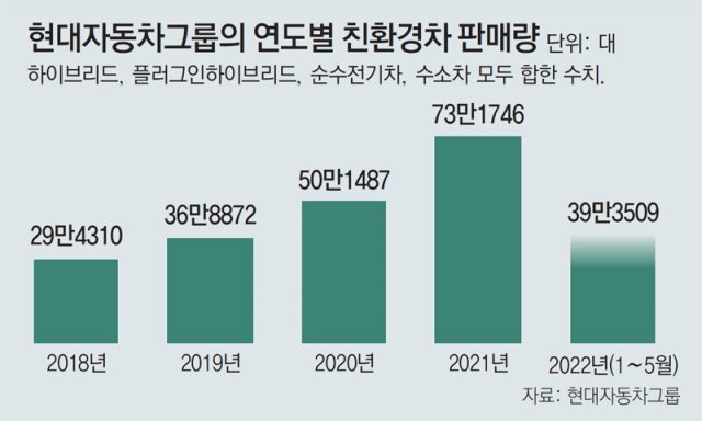 현대차그룹은 전 세계적으로 탄소 배출 규제가 강화되는 흐름이 나타나자 이에 대응하기 위해 친환경차 라인업을 늘려 왔다. 최근 전 세계 자동차 시장이 차량용 반도체 부족과 러시아의 우크라이나 침공에 따른 원자재 수급 어려움을 겪는 와중에도 현대차의 친환경차 판매는 고속 질주를 거듭했다. 현대차그룹의 올 1∼5월 판매량은 전년 동기 대비 5.9% 감소한 269만6697대인 반면 친환경차는 같은 기간 42.6% 증가하는 모습을 보였다. 특히 전기차 판매량이 76% 늘었고, 하이브리드와 플러그인하이브리드도 각각 31%, 26% 늘어났다.