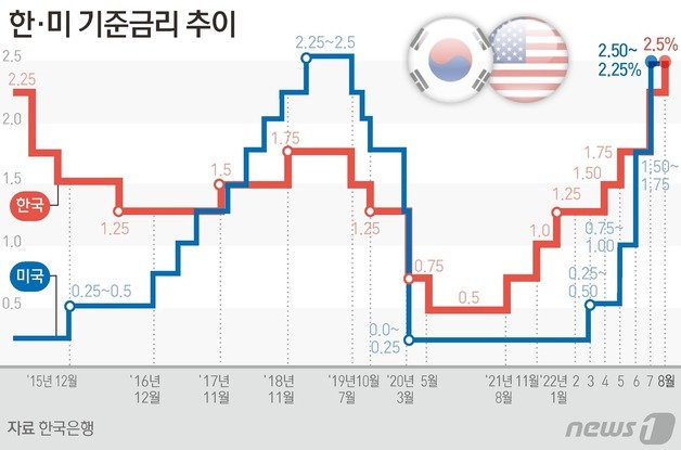 한국은행은 지난 25일 금융통화위원회 정례회의에서 기준금리를 기존 2.25%에서 2.50%로 0.25%p 높였다. 이로써 한미 금리는 동일 선상에 놓였다.