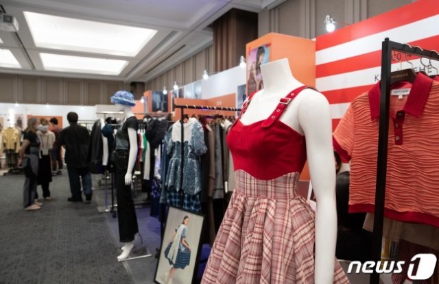 지난달 서울 강남구 코엑스에서 열린 2022 트렌드페어를 찾은 관람객들이 다양한 의류를 살펴보고 있다. 사진=뉴스1