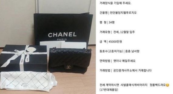 5일 부동산 커뮤니티 등에 따르면 최근 충남 천안시 서북구 불당동 소재 ‘천안불당지웰푸르지오’의 한 집주인은 본인의 전용면적 84㎡ 아파트 세입자를 모집하면서 전세 계약시 정품 샤넬백을 주겠다는 글을 올렸다.