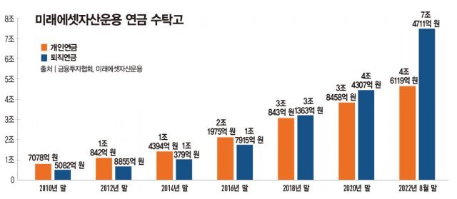 MZ세대의 재테크 트렌드, 디폴트옵션 도입 등으로 연금 투자에 대한 관심이 날로 높아지고 있는 가운데 국내 연금펀드 시장 강자로 꼽히는 미래에셋자산운용의 연금펀드에 지속적으로 자금이 유입되고 있어 눈길을 끈다. 금융투자협회에 따르면 지난 8월 말 기준 미래에셋 연금펀드 수탁고는 연금저축 등 개인연금펀드 4조6119억 원, 퇴직연금펀드 7조4711억 원으로 총 12조 원이 넘는다. 이는 국내 전체 연금펀드 시장(42조 원)의 30%에 육박하는 규모다.