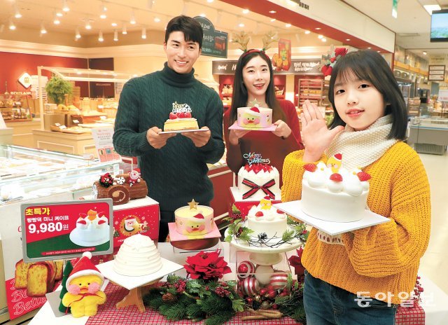 30일 오전 서울 이마트 용산점 블랑제리 매장에서 모델들이 신세계푸드가 크리스마스 시즌을 맞이해 출시한 9980원 케이크를 선보이고 있다.