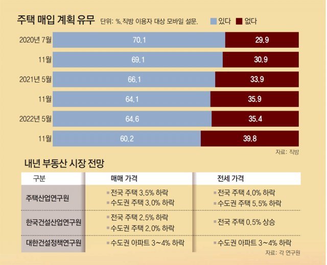 주택 매수를 계획하는 이도 줄고 있다. 12일 부동산 정보 플랫폼 직방은 지난달 16∼30일 자사 애플리케이션(앱) 이용자 1293명을 대상으로 설문한 결과 10명 중 6명(60.2%)이 내년에 주택을 매입할 계획이 있다고 답했다고 밝혔다. 이는 직방이 2020년 관련 조사를 시작한 이후 가장 낮은 수준이다.