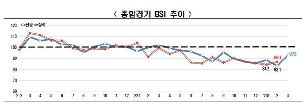 전국경제인연합회가 매출액 기준 600대 기업을 대상으로 기업경기실사지수(BSI)를 조사해 21일 발표한 결과 3월 BSI 전망치는 93.5를 기록했다. 전달 83.1 대비해선 10.4p(포인트) 반등했지만, 지난해 4월 99.1로 내려온 이후 1년째 기준선 100을 하회했다.