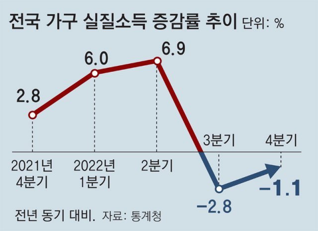 지난해 4분기(10∼12월) 물가 상승 영향을 반영한 실질소득이 2개 분기 연속 줄어든 것으로 나타났다. 금리 상승에 따른 이자비용 증가 폭은 역대 최대로 치솟았다.