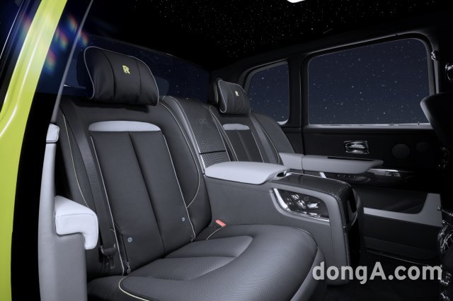 특히 롤스로이스는 칠흑처럼 검은 내부 공간의 분위기와 대조적으로 실내 스티칭과 파이핑, 헤드레스트의 RR 모노그램, 센터페시아 일부에 외장과 동일한 포인트 컬러를 반영해 서울 야경이 자아내는 화려한 분위기를 표현했다. 차 문을 열면 바로 보이는 도어 플레이트 바닥에는 한정판 모델임을 나타내는 문구(Lucid Nights Special Commission)를 새겨 넣었다.