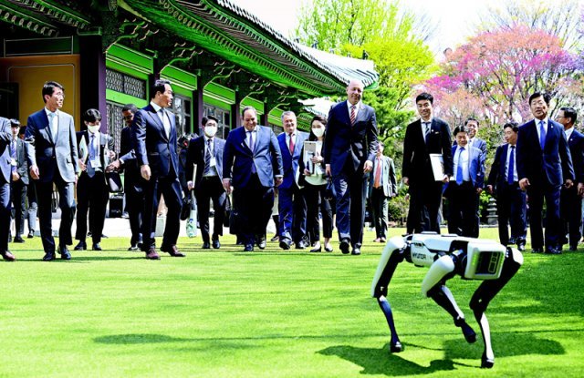 ‘2030 부산 세계박람회(엑스포)’ 실사를 위해 방한 중인 국제박람회기구(BIE) 실사단과 부산엑스포 유치지원 민간위원들이 3일 서울 중구 신라호텔에서 열린 환영 오찬에 앞서 로봇 개 ‘스폿’의 안내를 받고 있다.