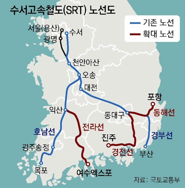 국토교통부는 철도산업위원회와 당정 협의를 거쳐 경부·호남고속선에 한정된 SRT 운행을 올해 9월부터 경전선(창원·진주), 전라선(순천·여수), 동해선(포항)으로 늘린다고 4일 밝혔다. 올해 1월 국토부 업무계획에서 수서발 고속철도 운행 확대 계획을 밝힌 데 이어 운영주체, 대상 노선, 운행 시기 등을 구체화했다. 수서발 경전선은 윤석열 대통령 공약이기도 하다.